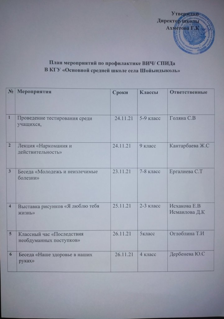 План мероприятий по профилактике ВИЧ/СПИДа в КГУ "Основная средняя школа села Шойындыколь"