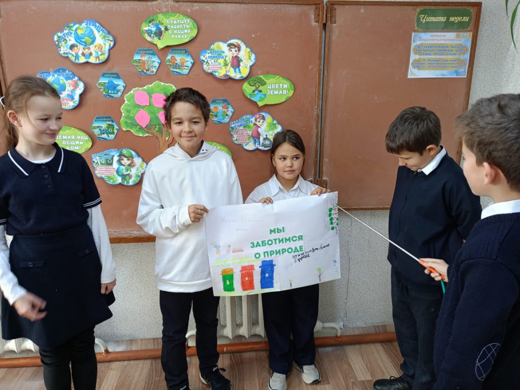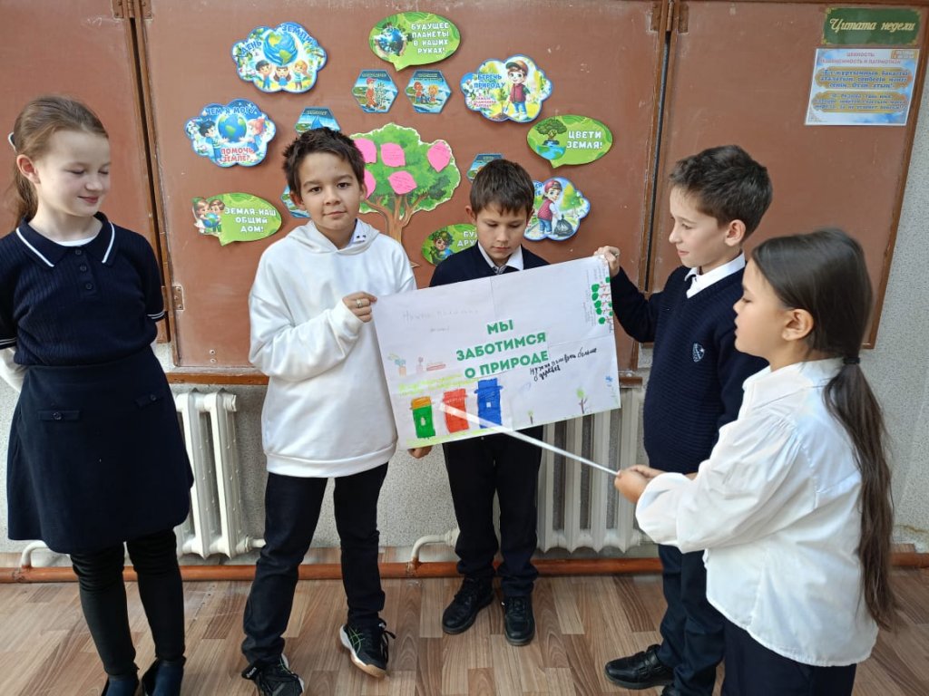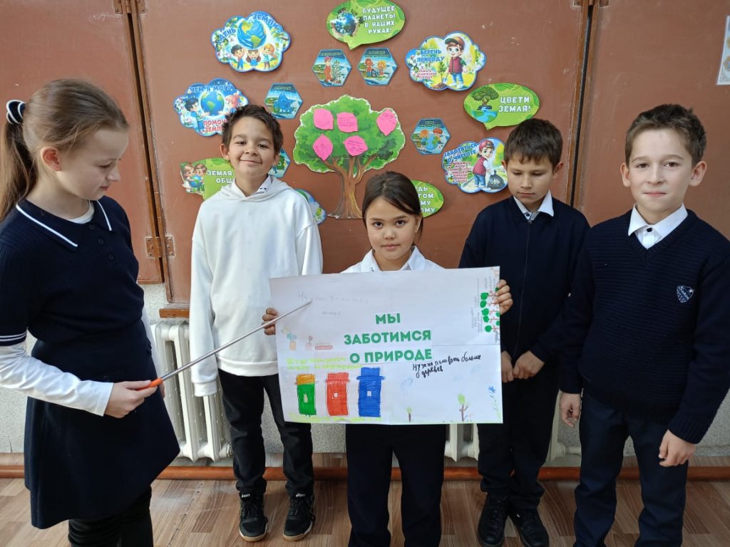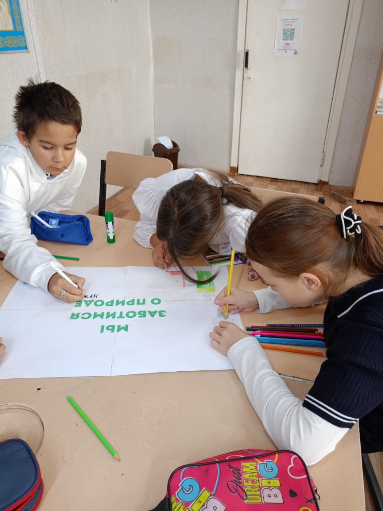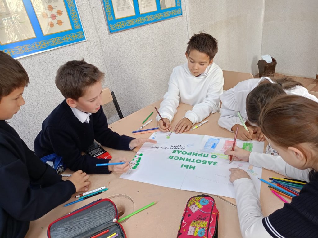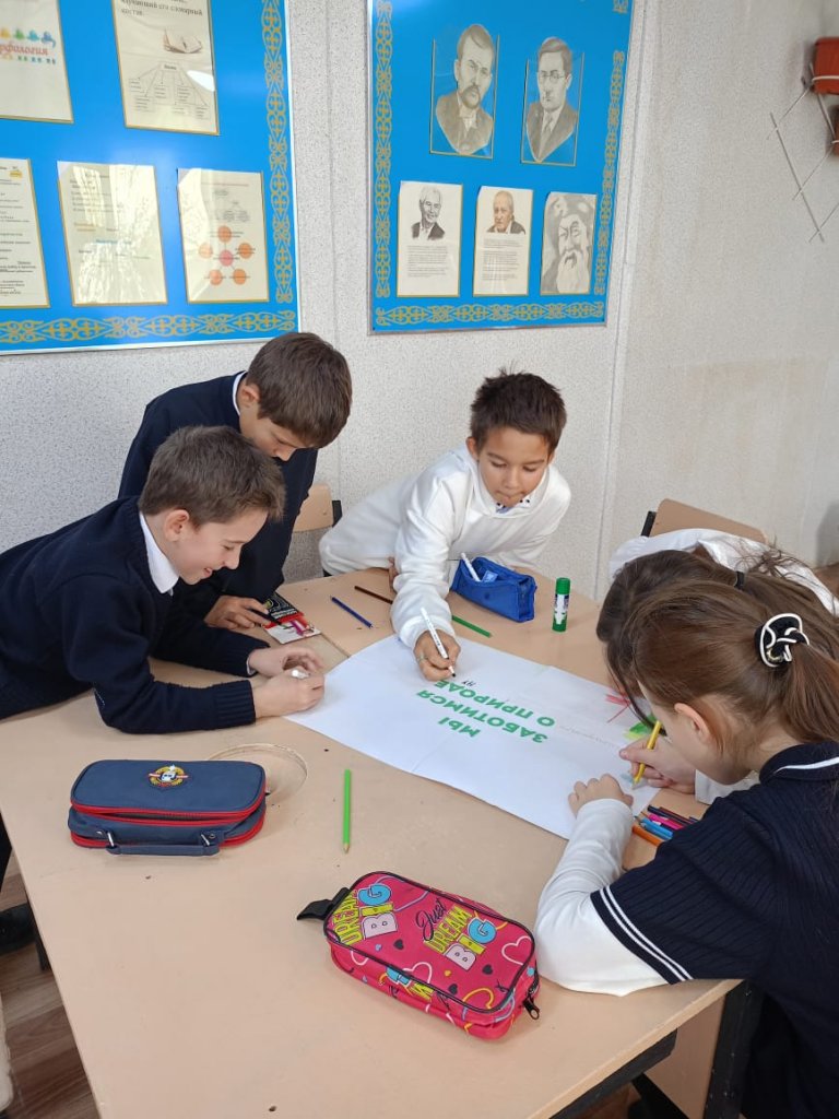 6 қазанда 5-сыныпта "біз табиғатқа қамқорлық жасаймыз"тақырыбында сынып сағаты өтті. Оқушылар "біз табиғатқа қамқорлық жасаймыз" плакатын салып, " табиғатта өзін қалай ұстау керек?».