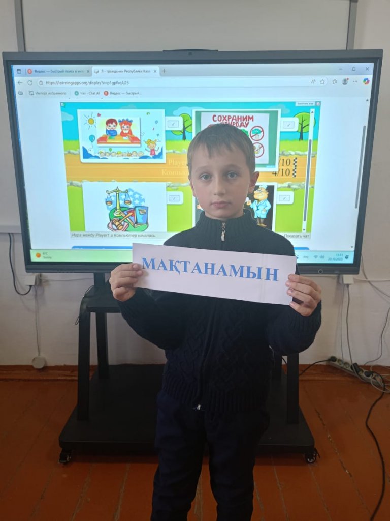 "Геральдикалық", " мен қазақша сөздерді білемін! ", "Құқықтар мен міндеттер ","Мәдени мұра", "Менің Отанымның астанасы".